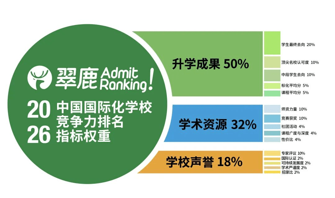 翠鹿排行榜基于升学成果、学术资源以及学校声誉三个方向对国际化学校进行多维度的评估。