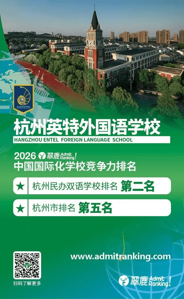 近日,2026年度“翠鹿中国国际化学校竞争力排名” 正式公布。我校凭借卓越的综合办学实力,从全国千余所国际化学校中脱颖而出,首次跻身全国百强(第100名),并位居杭州地区第5名,杭州民办双语学校第2名