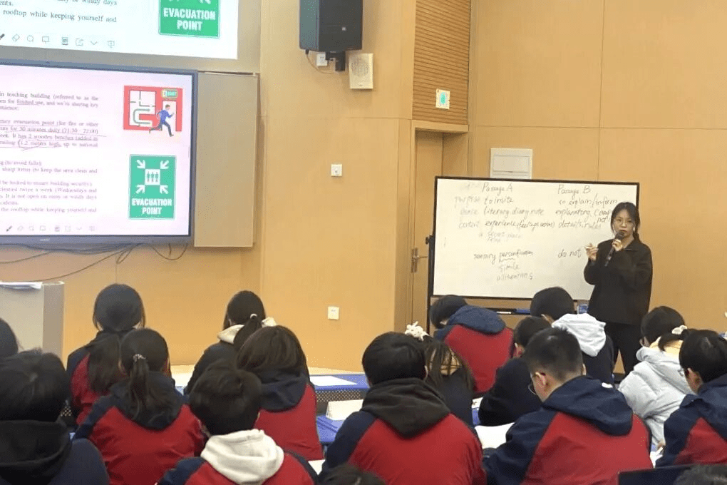 在准备阶段,吴老师于1月18日中午拿到指定的上课材料——一组题为“The Evening Study Rooftop”的跨体裁对比文本(文学体裁的日记片段与说明体裁的校园通知)。面对仅三天的准备时间,吴静齐老师迅速投入,潜心钻研文本。同时,校督学沈玉荣老师和外语组的老师们给予了充分的支持。