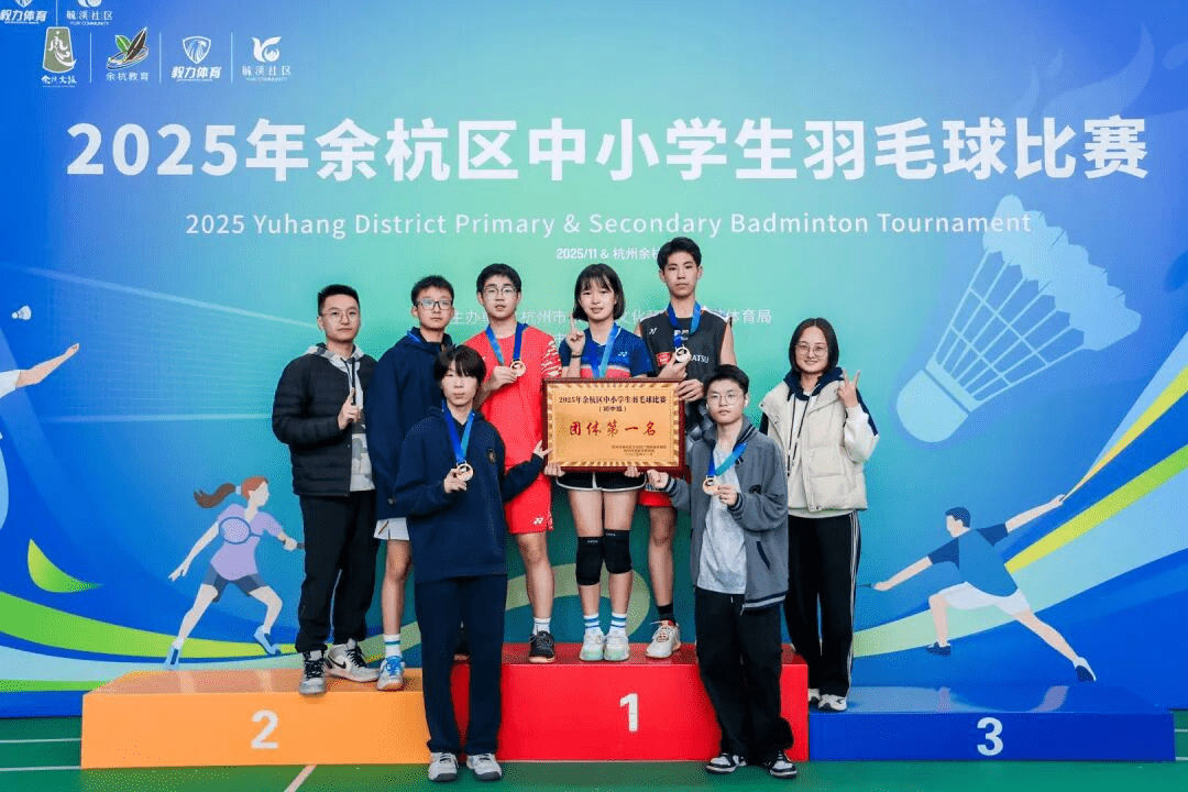 11月24日,余杭区青少年羽毛球锦标赛圆满落幕。我校初中部羽毛球队的10名运动员凭借精湛技艺与顽强斗志,一举斩获5枚金牌(含男双、混双、男单项目)及初中组团体总分第一名,刷新了我校在该赛事的历史最佳战绩。这场胜利不仅展现了英特学子的体育精神,也彰显了学校“五育并举”教育理念的丰硕成果。