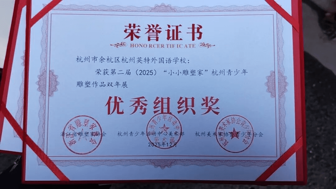此次获奖,不仅是对同学们艺术才华的肯定,也是杭州英特外国语学校长期坚持“五育并举”、重视美育熏陶的成果体现。学校依托余杭地域文化资源,开设陶艺工坊、雕塑社团等特色艺术实践平台,引导学生从本土文化中寻找创作母题,在动手实践中感悟材料与形态之美,实现文化认同与审美能力的同步提升。