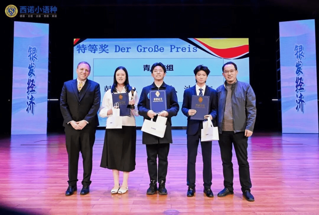 决赛中,高二5班文艺霏、韩竞飞、沈彧左团队以《科技与人文:面向未来的养老关怀》为主题,通过对比现实护工短缺与未来AI个性化护理的图景,以流畅的德语和富有感染力的表演,生动诠释科技对人文健康的反哺,荣获青少年组全国特等奖。高二6班陆新雨、朴然、孙盛凝、杨笑团队则以创意“投资综艺”形式,聚焦一根融合健康监测与情感关怀的智能拐杖,回应了老年人对亲情陪伴的渴求,荣获青少年组全国二等奖。